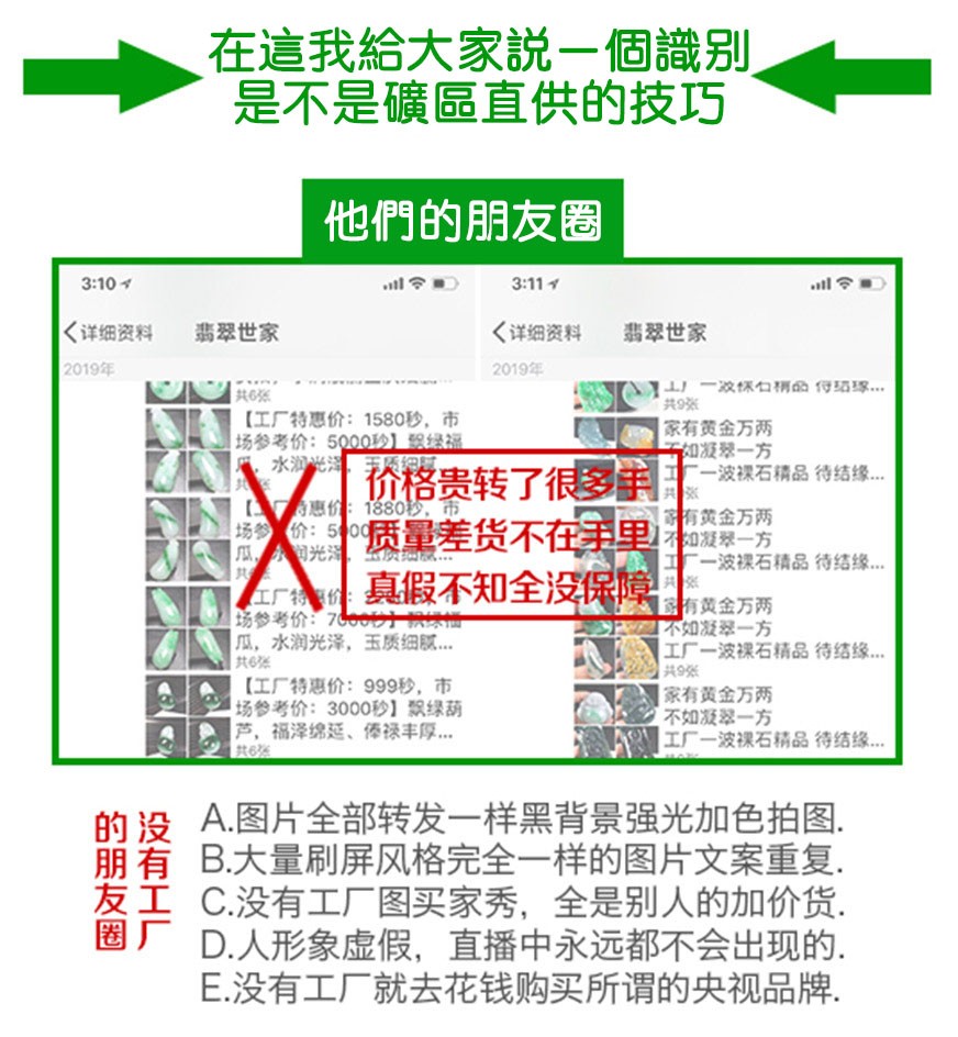 朋友圈很多微商都是市場上拍照轉發圖片,實際上手裏貨都沒有,也沒見到貨,這樣多次轉手翡翠不好價格還很貴,那要如何識別他們呢?