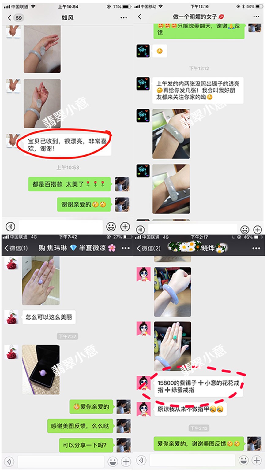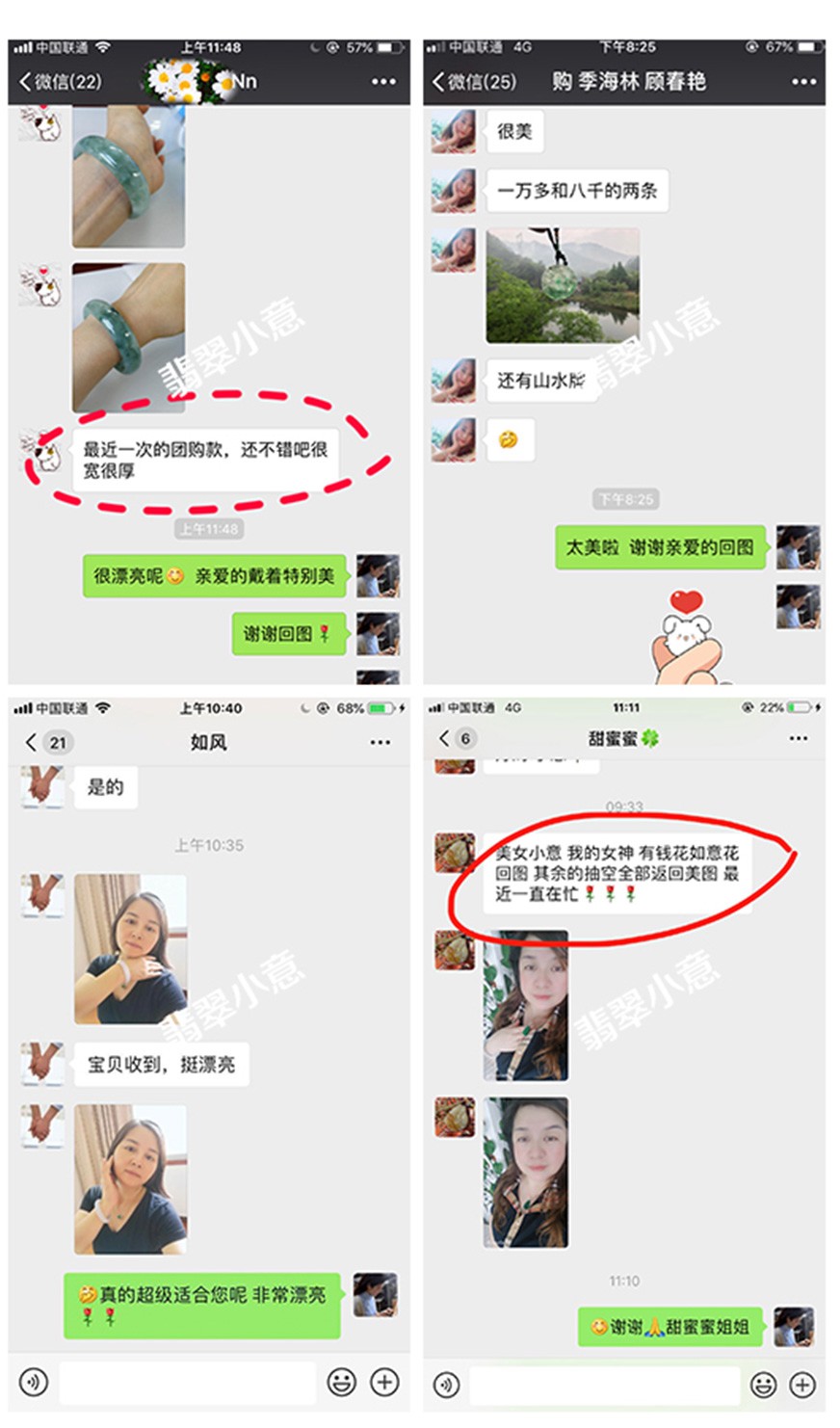每周我們都會做買家秀評選,拍得最認真的會收到我送出的精美禮物,結果越來越多的客人都發來了佩戴我們翡翠的漂亮照片過來,這是我最享受的時刻,也是對我工作的肯定。